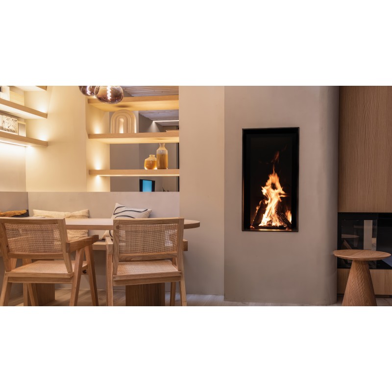 Благодаря вытянутому вверх стеклу (высотой почти 90 см), эта модель идеально подходит для создания эффектных световых акцентов в современных интерьерах, позволяя наблюдать за пламенем во весь рост.
