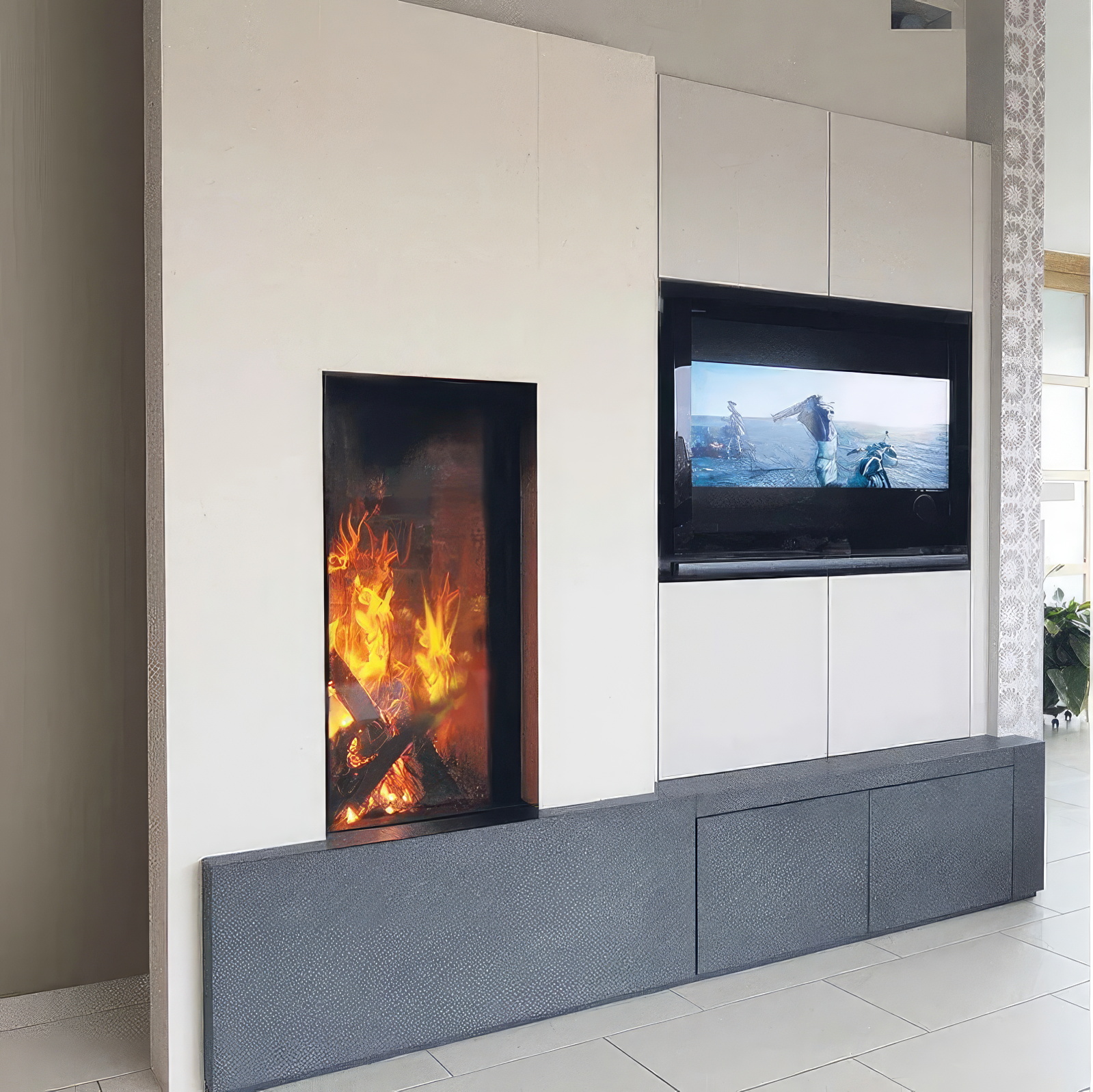 Безупречная эстетика: Полное отсутствие видимой рамы (Pure Face) создает эффект открытого очага, встроенного прямо в стену.