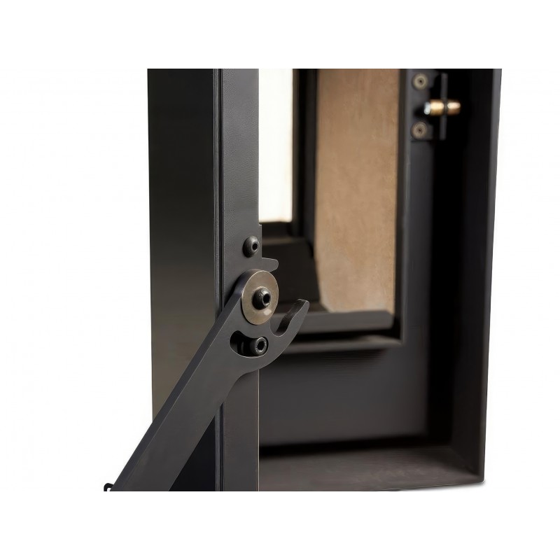 Топка оснащена системой самоочистки стекла (чистое стекло), вторичным дожигом газов, трехсторонней подачей воздуха (первичный, вторичный, третичный), зольником и возможностью подключения внешнего воздуха. Дополнительно: опция EControl для автоматического регулирования горения, встроенные вентиляторы для распределения тепла, охладитель дыма и отсутствие шибера. Материалы обеспечивают длительное горение и экологичность (низкие выбросы).