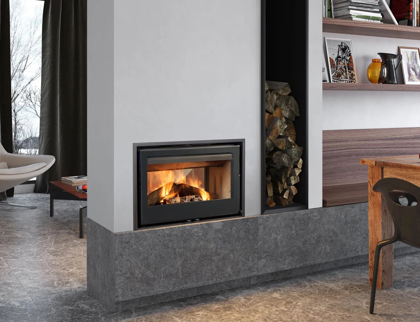 Подходит для модерного стиля, встроенной двусторонней установки. Размеры позволяют вписать в стену шириной 1 м. Сертифицирована по европейским нормам (низкие выбросы CO ~41–109 мг/Нм³, температура дымовых газов ~200–300°C). Рекомендуется профессиональная установка с учетом норм пожарной безопасности.