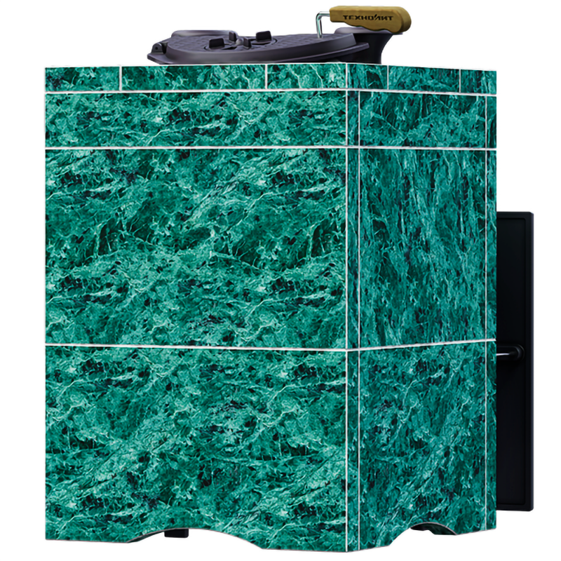 Облицовка из кирпичиков змеевика - это простой и эффективный способ создать режим русской бани. Облицовка представляет собой плитки зелёного камня с краями, обработанными фаской. Из-за этих краёв облицовка имеет чёткий рисунок, который полностью имитирует настоящую кирпичную кладку. Эта облицовка также, как и облицовка из классического кирпича, останавливает жёсткое инфракрасное излучение и конвекцию, легко собирается/разбирается и не требует никаких специальных навыков при сборке.