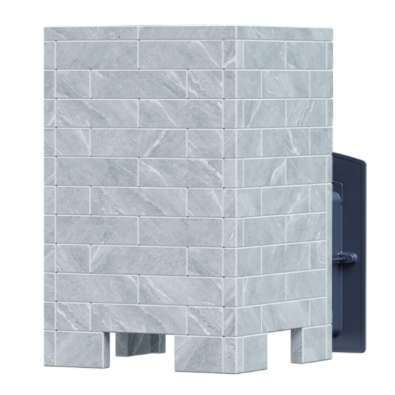 Талькохлорит – это плотный, прочный и термически устойчивый горный камень, идеально подходящий для изготовления облицовки. Прекрасно накапливает тепло и имеет красивый внешний вид. Его цвет неоднородный, а включает в себя всю палитру серого цвета с мелкими вкраплениями желтого и зеленого. Облицовка представляет собой кирпичики талькохлорита с краями, обработанными фаской. Печь в такой облицовке дарит приятное тепловое излучение, которое идеально подходит для создания режима русской бани.