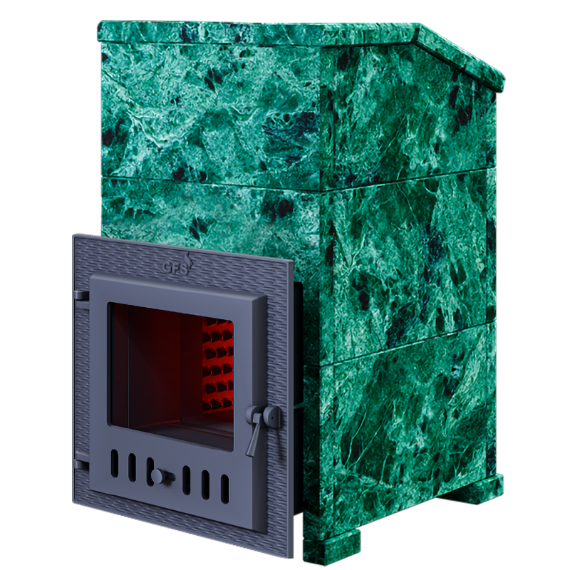 Комплект GFS Гефест ЗК 40(М) Президент 1130/40 Змеевик - печь с усиленной каменкой большей массы, с единым углублением внутрь топки для дополнительной укладки чугунного заряда. Теплосъемные шипы со стороны горения пламени в разы увеличивают площадь соприкосновения огня с каменкой и ускоряют передачу тепла, а также способствуют лучшему дожигу, смешивая потоки пламени и воздуха,  поступаемого из воздушника. Эти усовершенствования значительно повышают мощность парообразования печи и выдают большее количество пара при непрерывной подаче воды. Каменка печей GFS Гефест-ЗК является незаливаемой.