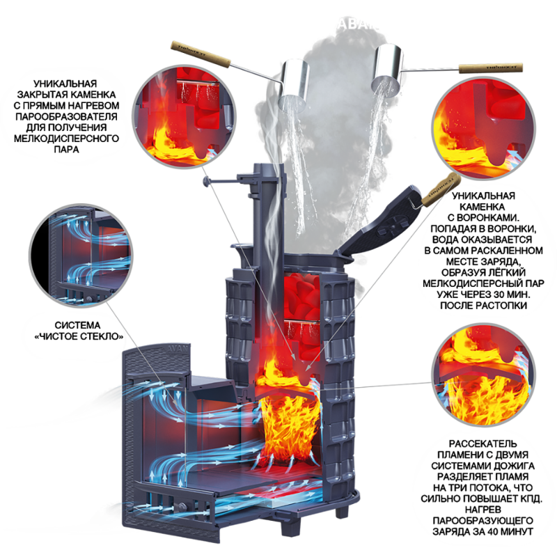 Не имеющая аналогов каменка толщиной 45 мм обеспечивает непревзойденную надежность и высокую теплоемкость, 120 теплосъемных шипов по всей её поверхности, позволяют каменке нагреться за 60 минут до 700 градусов и долгое время удерживать тепло.