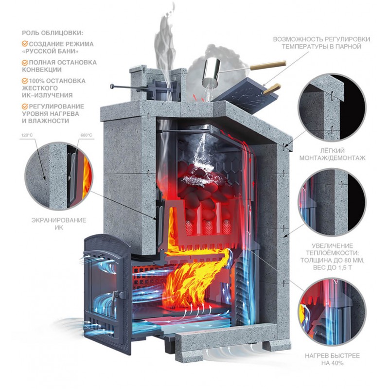 Печь Гром с уникальной каменкой прямого нагрева для получения легкого мелкодисперсного пара, необходимого для режима русской бани. Благодаря инновационной конструкции, печь гарантированно входит в режим за 60 минут.