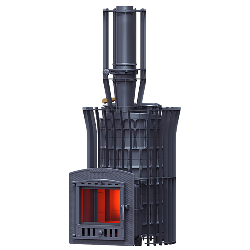 Масса пароиспарителя в печи AVANGARD 51 кг, и он нагревается прямым контактом с пламенем. У пароиспарителя 2 поверхности с увеличенной рабочей площадью – снизу идёт нагрев огнём, а сверху поддаётся вода для пара. У печи уникальная, массивная каменка с теплонакопительными воронками, для получения легкого пара.