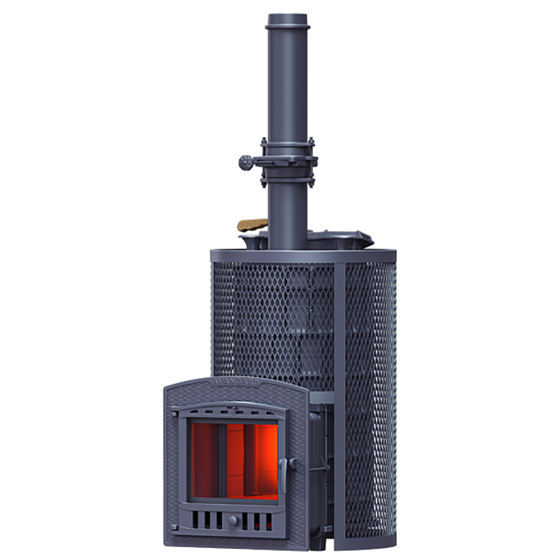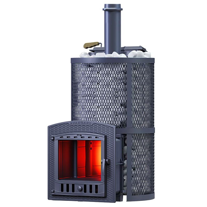 Масса пароиспарителя в печи AVANGARD 51 кг, и он нагревается прямым контактом с пламенем. У пароиспарителя 2 поверхности с увеличенной рабочей площадью – снизу идёт нагрев огнём, а сверху поддаётся вода для пара. У печи уникальная, массивная каменка с теплонакопительными воронками, для получения легкого пара.