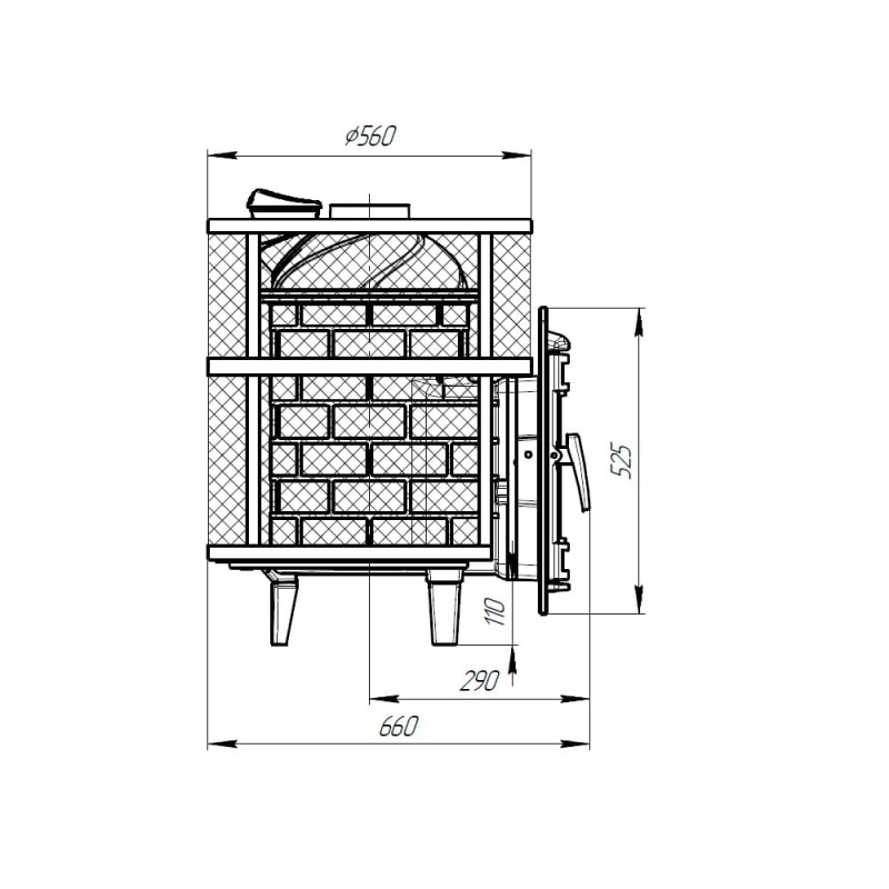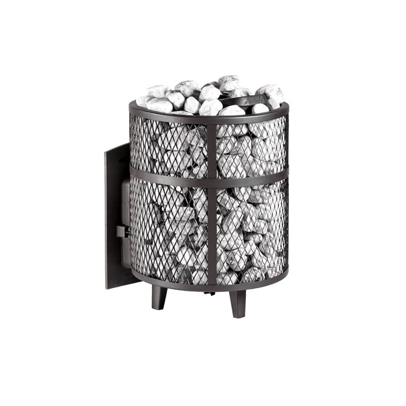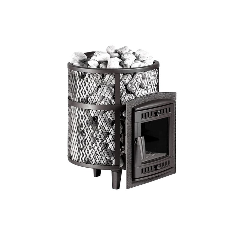 Кожух печи выполнен в виде сетки из стали и полностью заполняется природными камнями, обеспечивая высокую динамику нагрева парильного помещения.