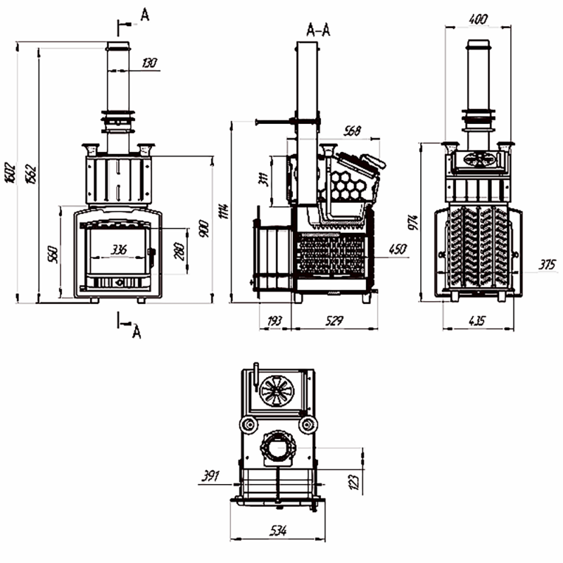Благодаря направленной конвекции воздушного потока, происходит очистка стекла, на его поверхности не оседает сажа и копоть, стекло долгое время остается полностью чистым и прозрачным.