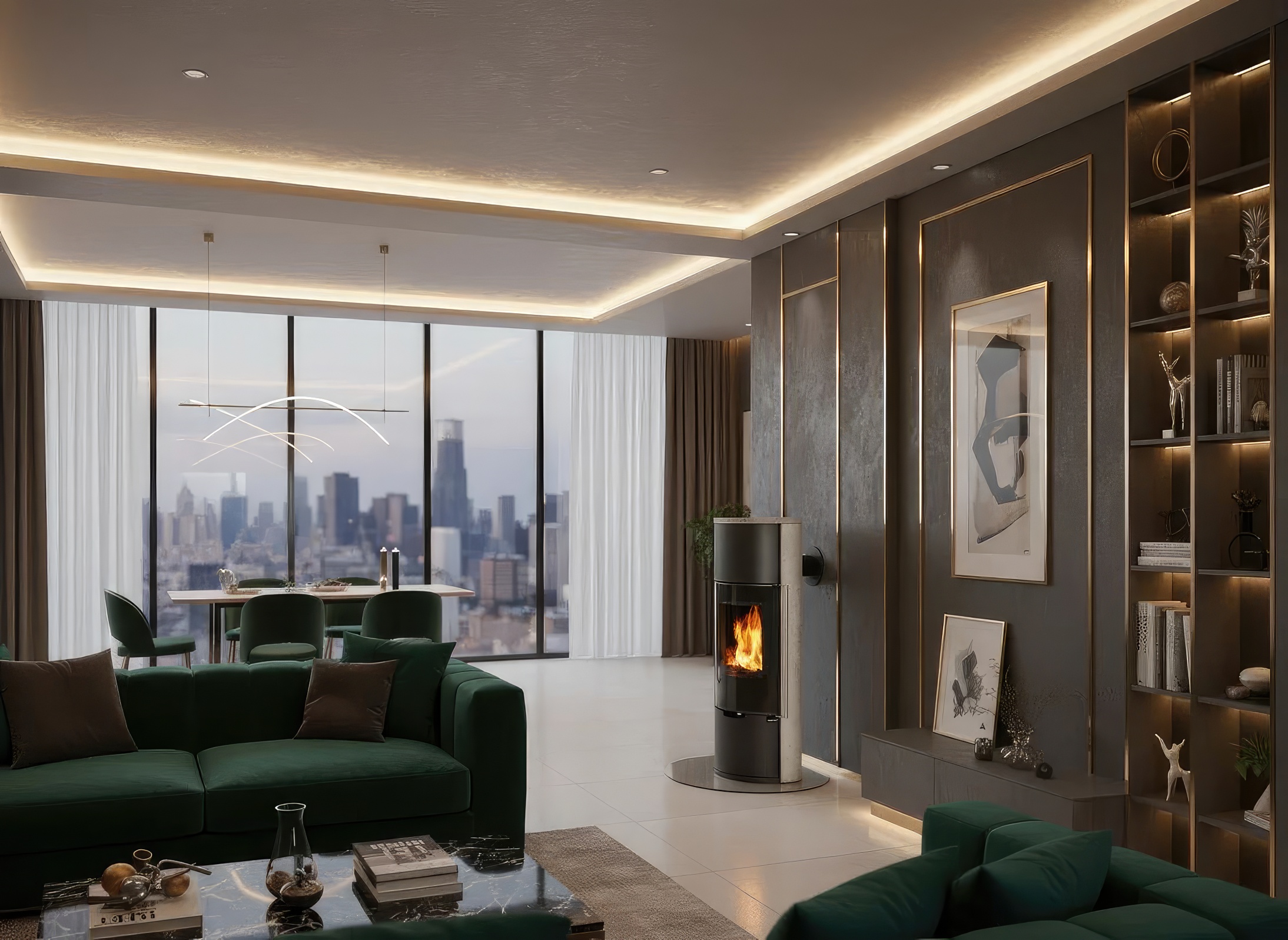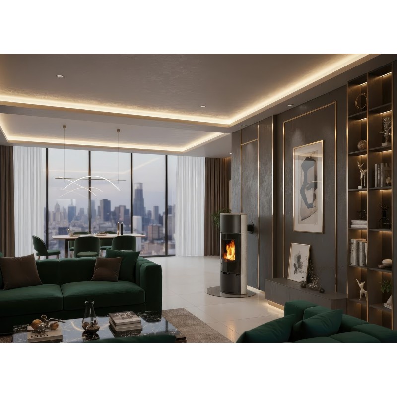 Печь-камин Ember E11 FG из камня Serpentino — это усовершенствованная версия классической модели E11, созданная для интерьеров, где эстетика играет ключевую роль. Главное отличие серии Full Glass (FG) — цельностеклянный фасад с декоративной черной рамкой (шелкографией). Это решение превращает отопительный прибор в настоящий арт-объект, делая акцент на чистоте линий и яркости пламени.
