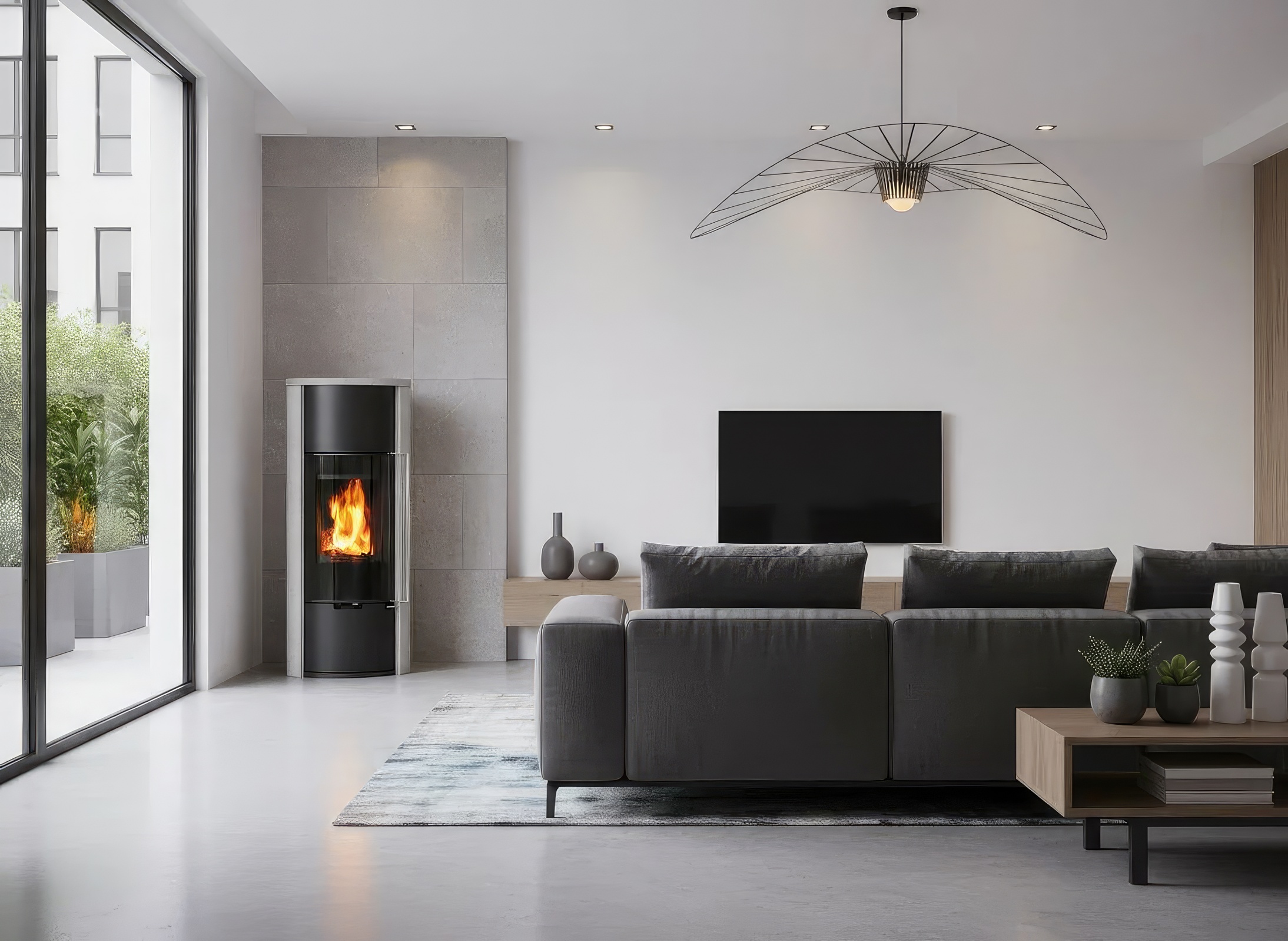- Система Airwash («Чистое стекло»): Специальные направленные потоки воздуха создают защитный барьер, благодаря чему панорамное стекло остается прозрачным даже при интенсивной топке.