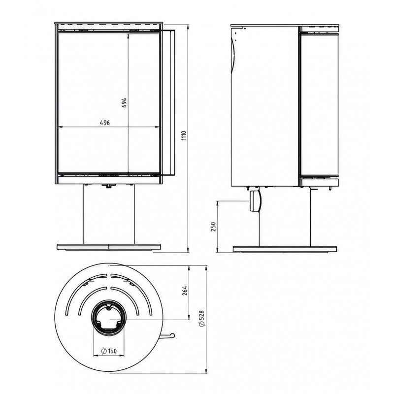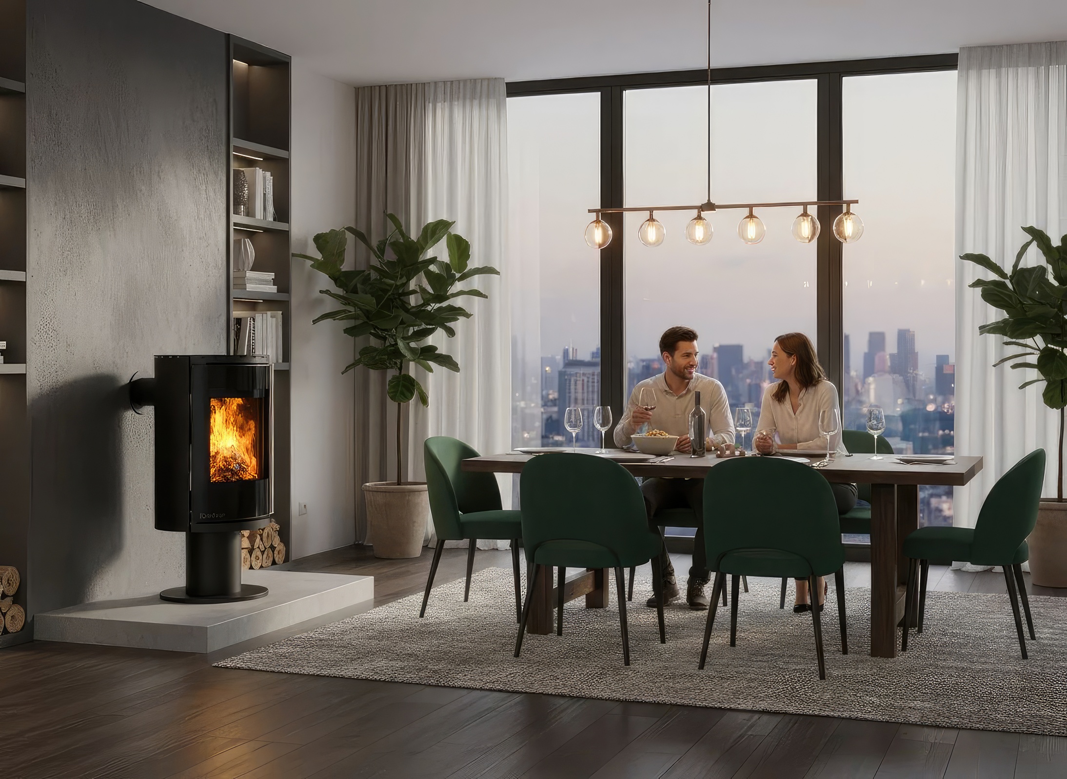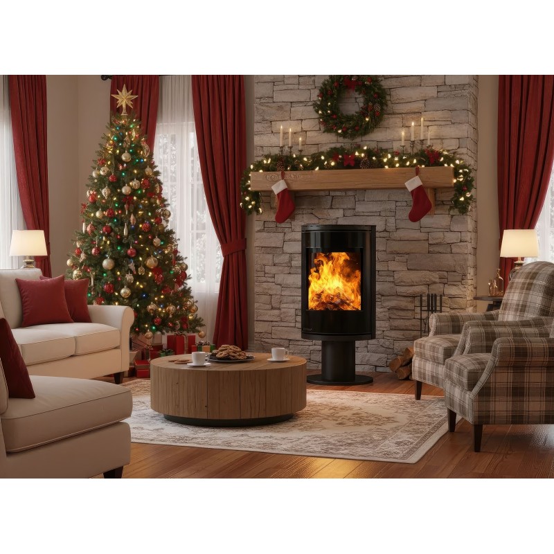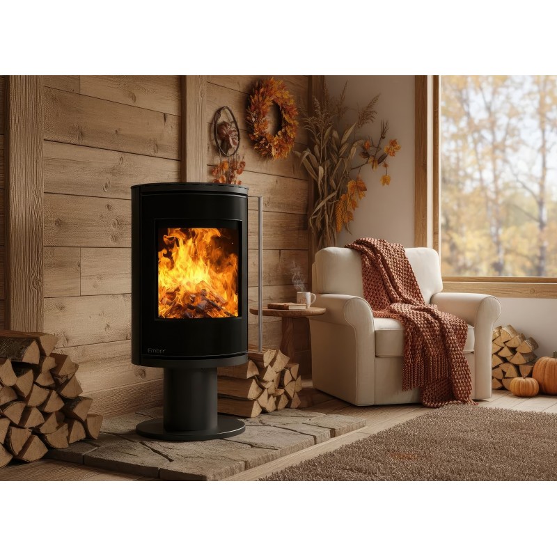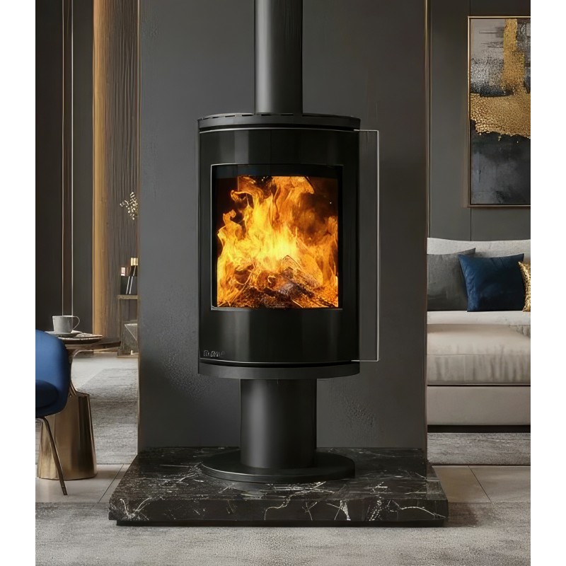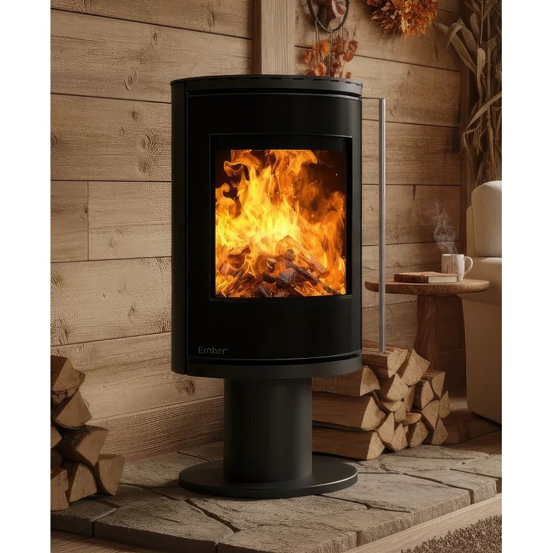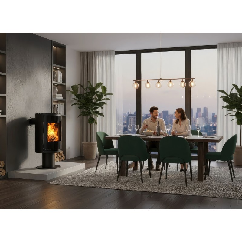 Несмотря на компактный диаметр, Ember F16 FG обладает мощностью 6 кВт и высоким КПД 81%. Топка футерована теплоемким вермикулитом, который способствует полному сгоранию топлива. Модель поддерживает подключение внешнего воздуха (CPV) через основание стойки, что делает её идеальным выбором для современных герметичных домов.