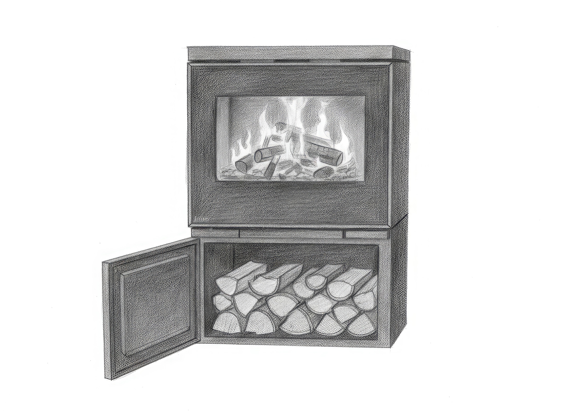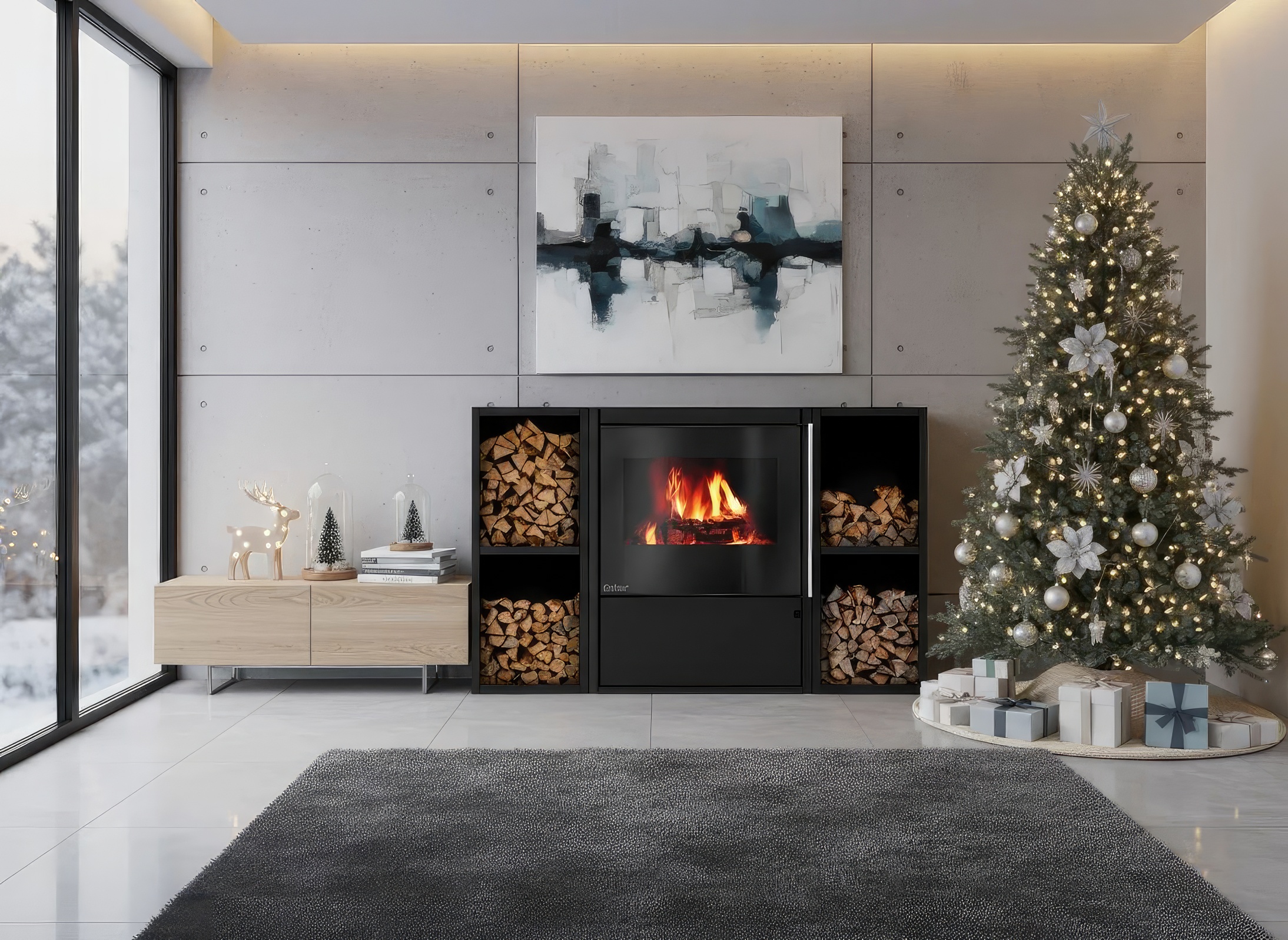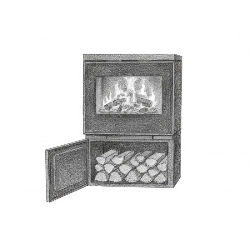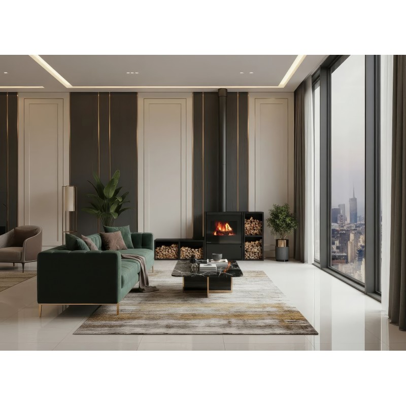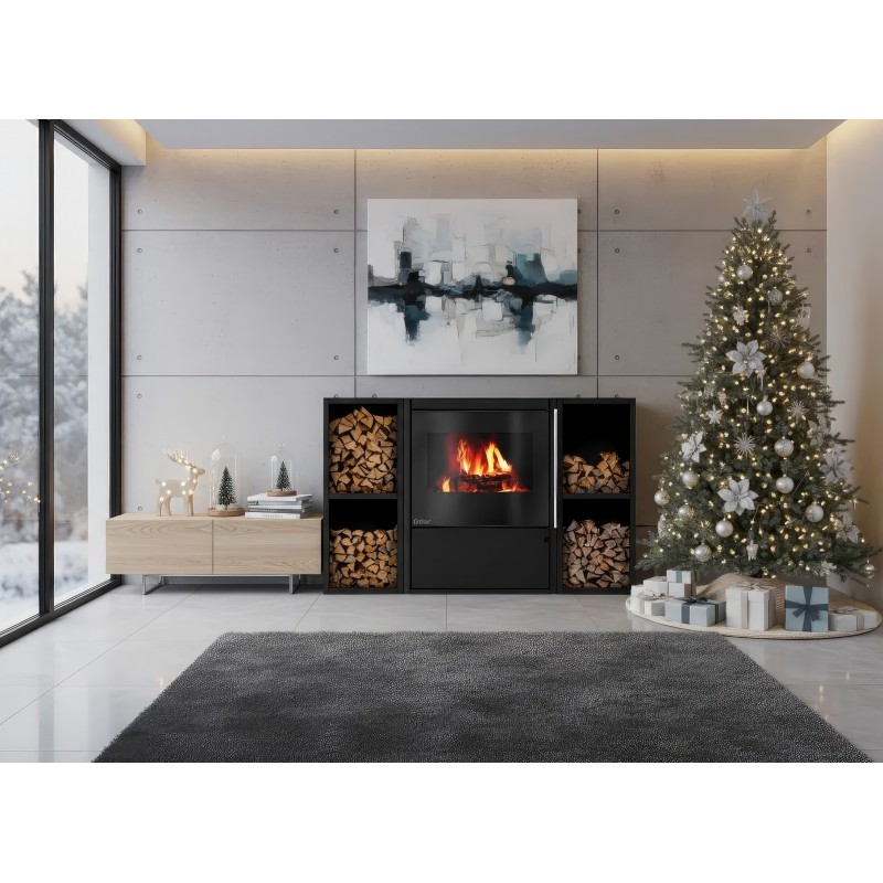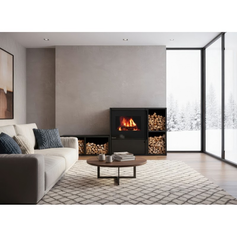Корпус выполнен из котловой стали, а камера сгорания футерована вермикулитом, который отражает тепло в комнату и защищает конструкцию от перегрева. В нижней части предусмотрена открытая ниша для дров, которая подчеркивает горизонтальную эстетику модели и обеспечивает удобство эксплуатации.