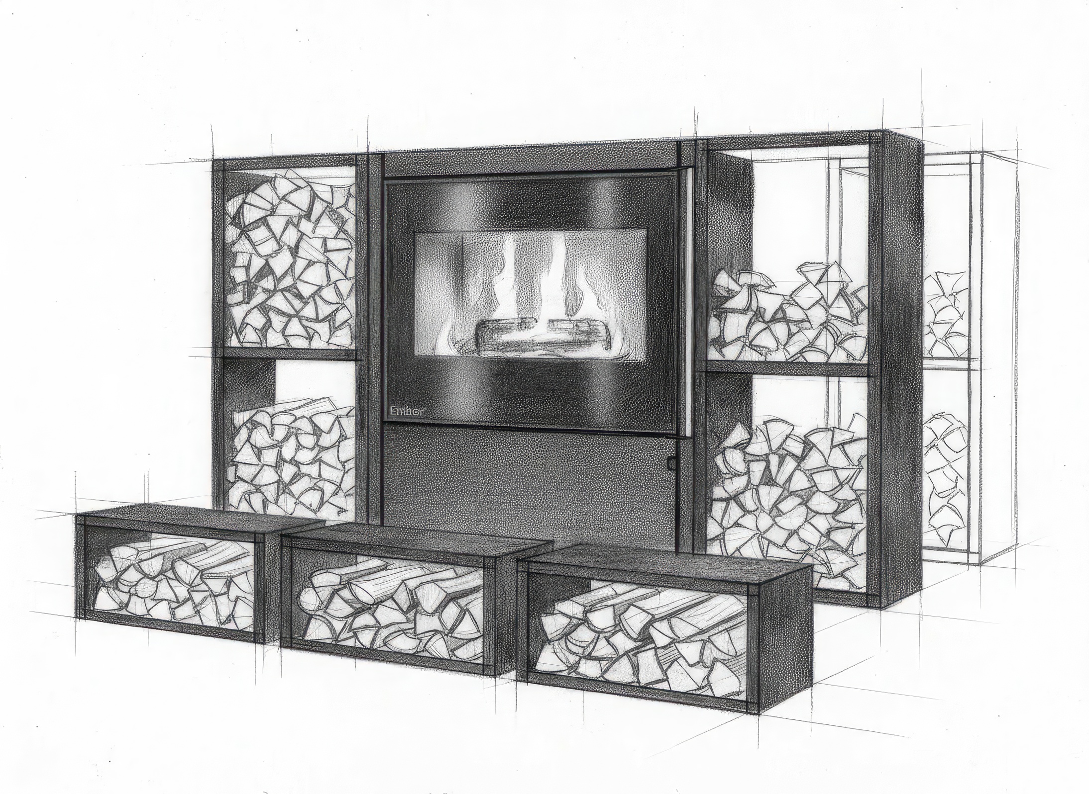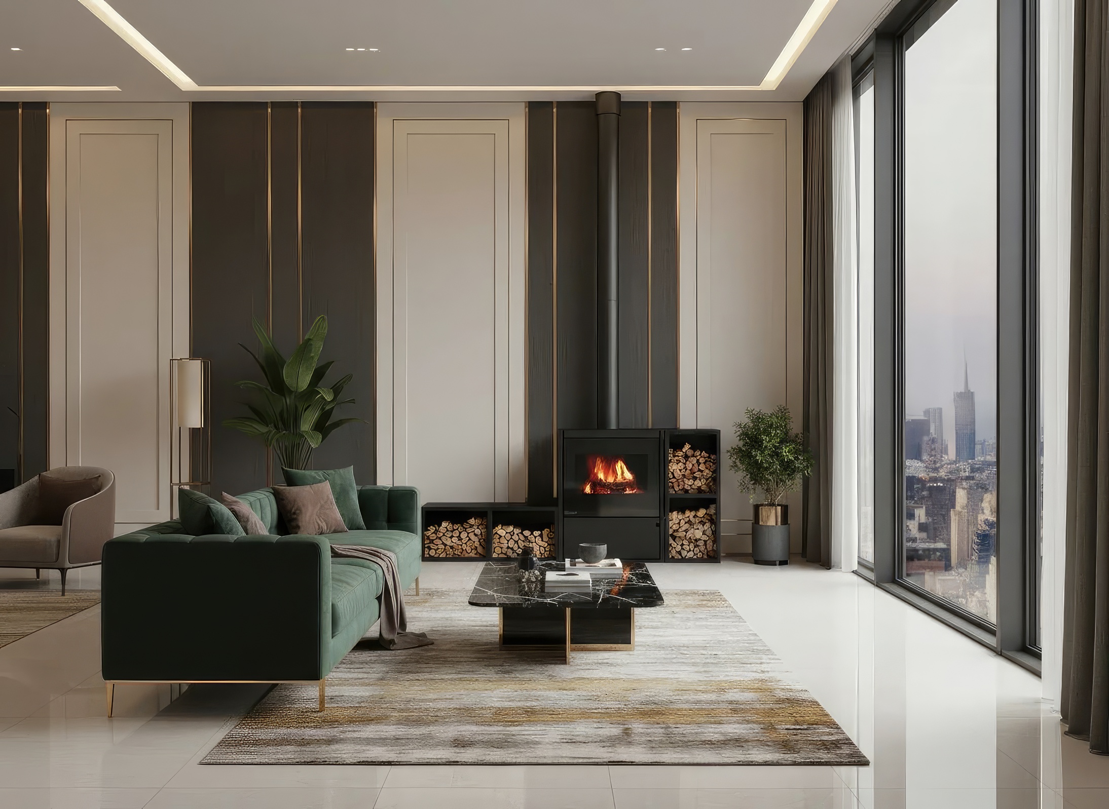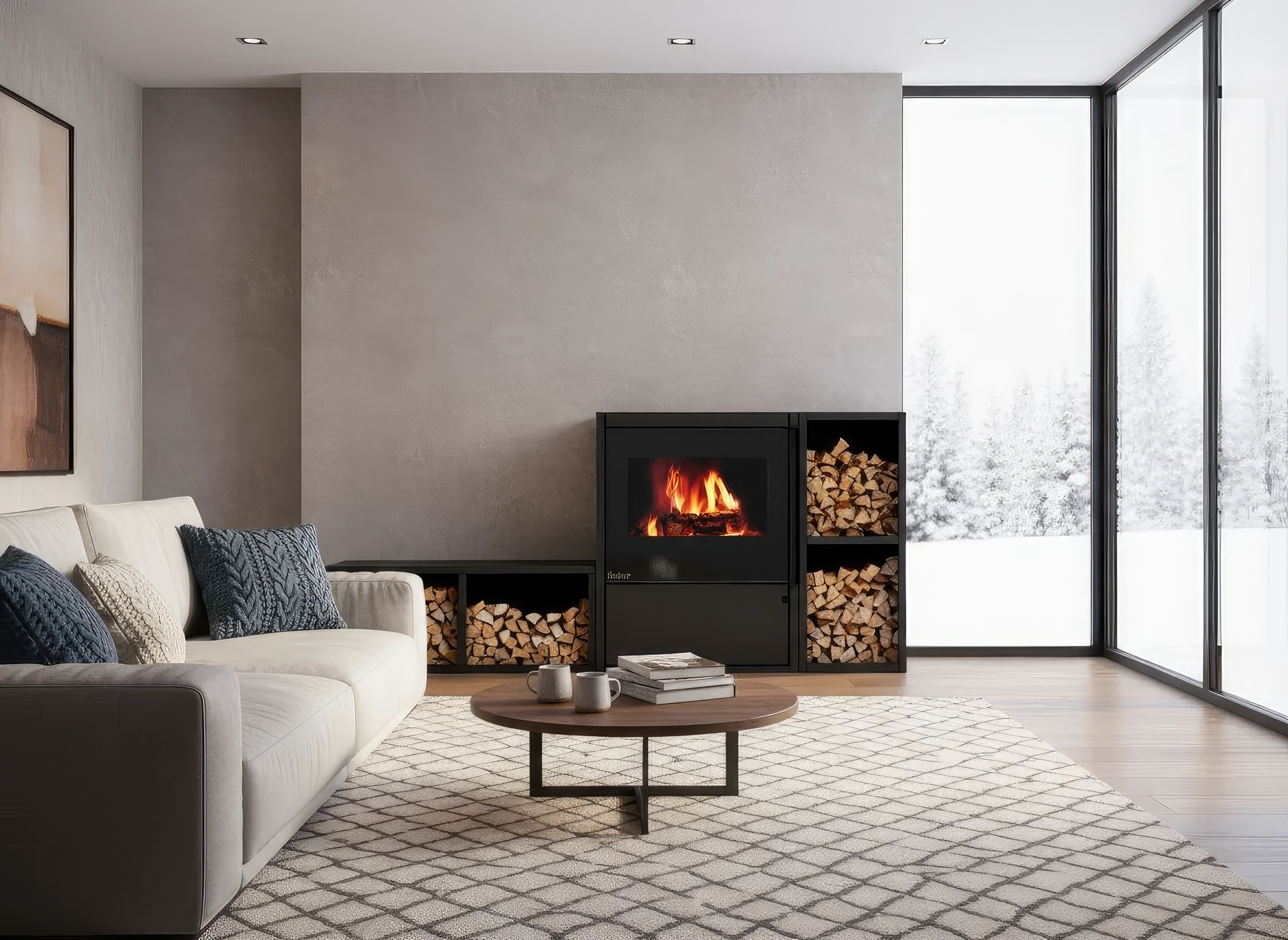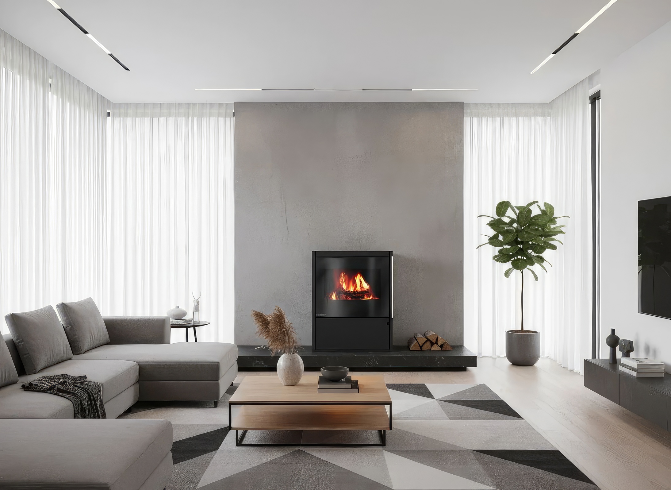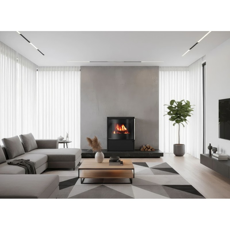- Широкоформатный фасад: Горизонтальное стекло позволяет использовать длинные поленья (до 45-50 см) и создает визуальный эффект полноценного каминного портала.