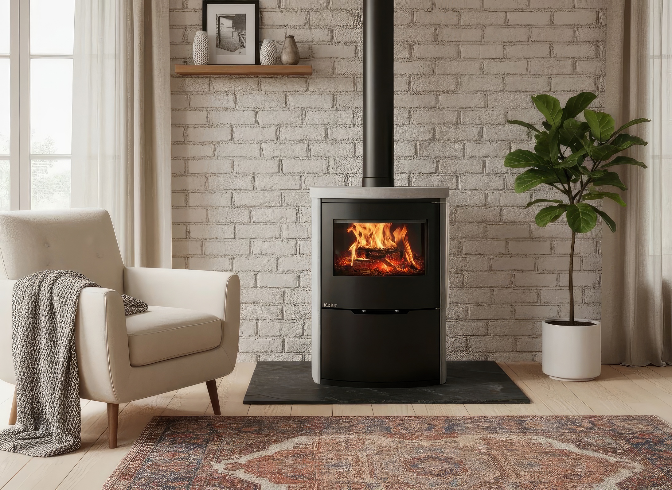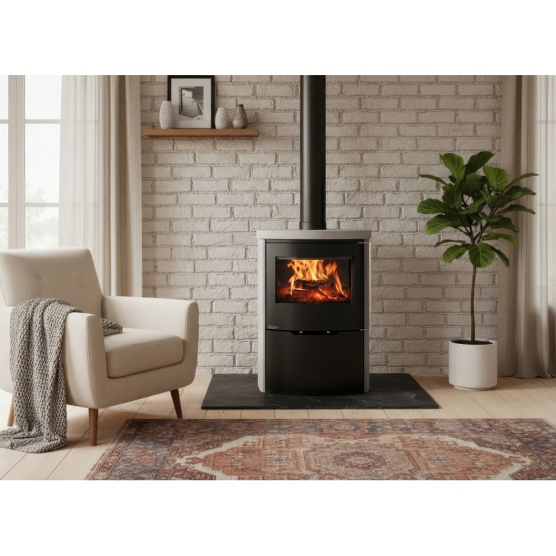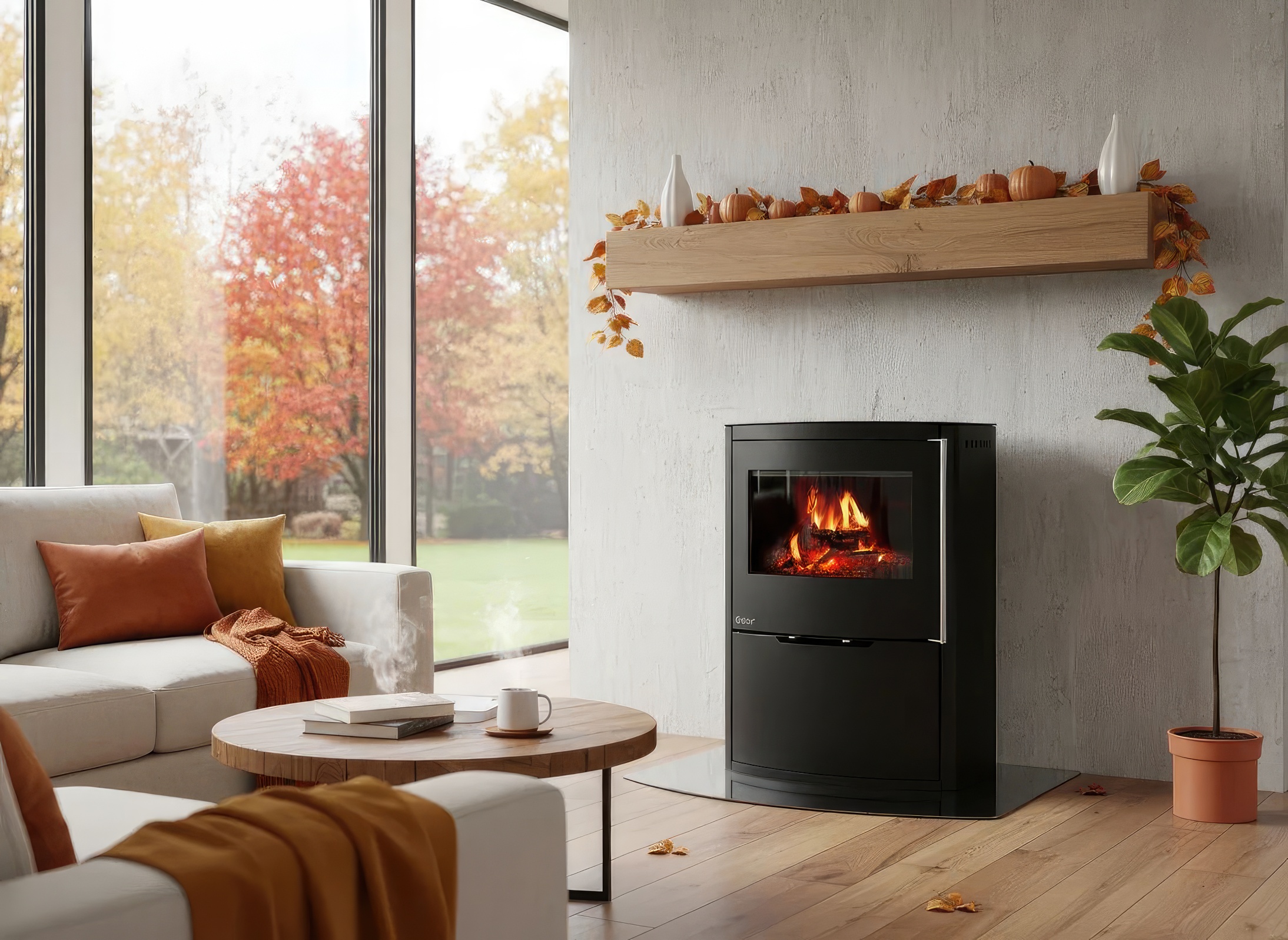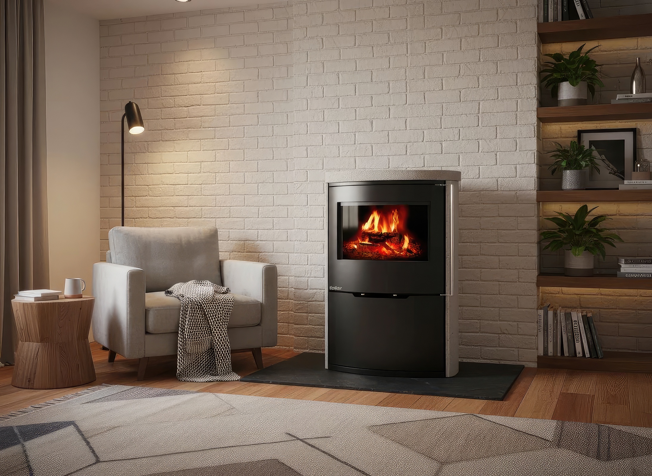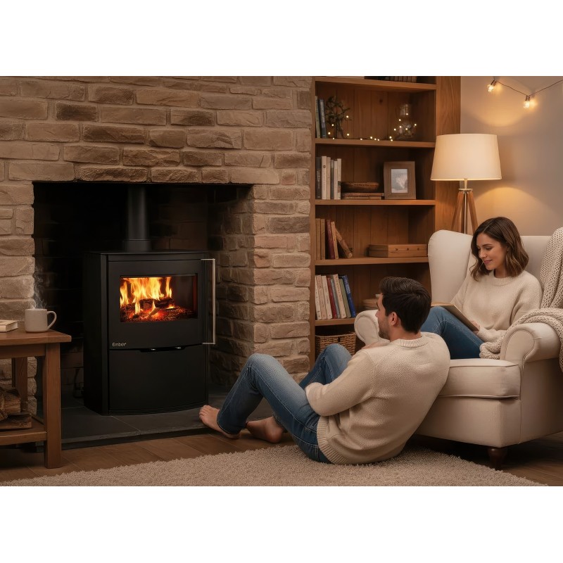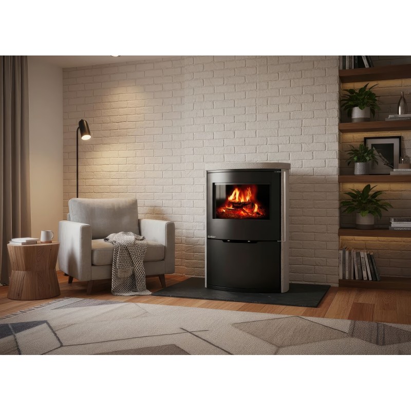 Ember O1 XL оснащена системой внешнего подвода воздуха (CPV), что позволяет подключать забор кислорода напрямую с улицы. Это исключает выжигание воздуха в помещении и обеспечивает стабильную тягу. Внутренняя отделка из светлого вермикулита создает яркий контраст с черным корпусом и способствует полному дожигу газов, повышая экологичность отопления.