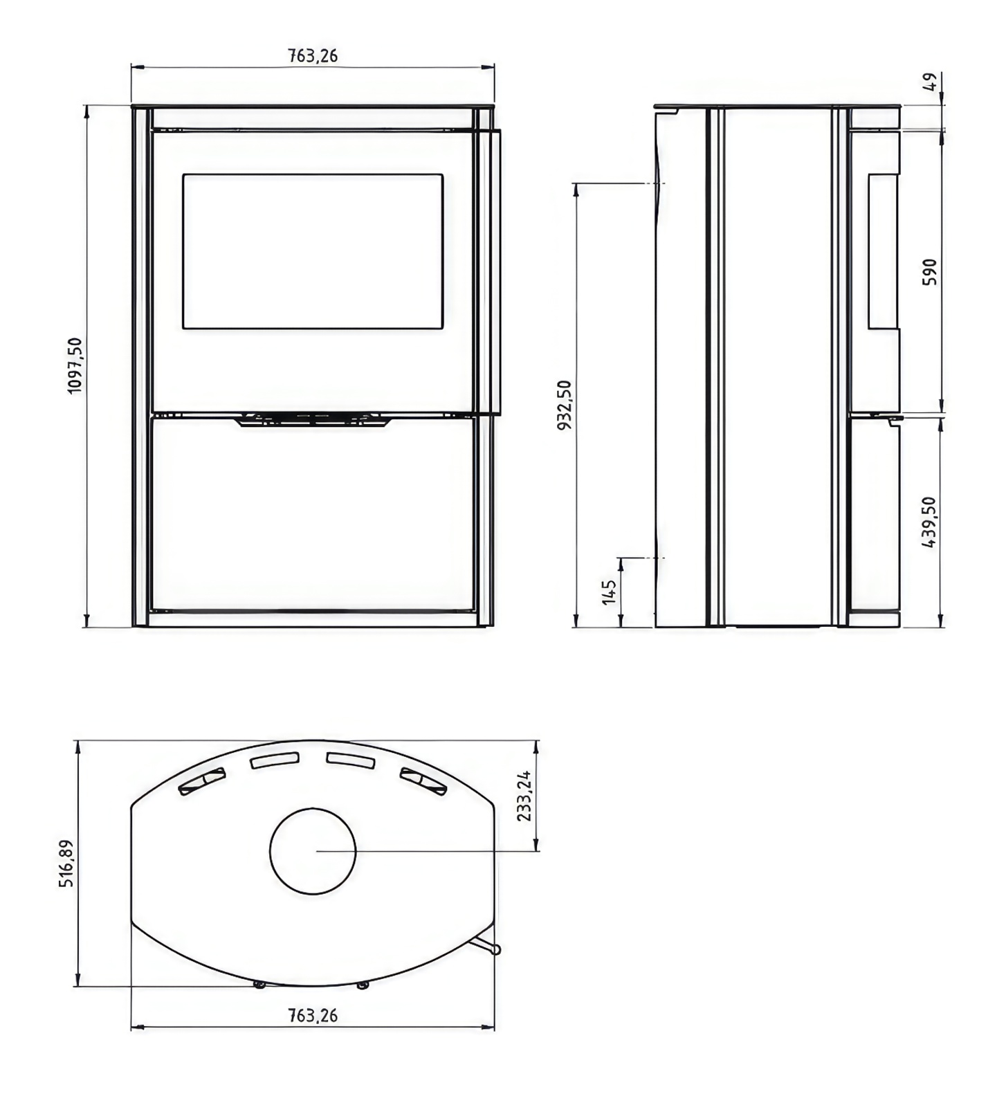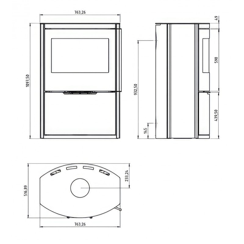 - Остекление Full Glass: Панорамное стекло с черной шелкографией визуально расширяет границы огня, скрывая раму дверцы и подчеркивая премиальный статус устройства.